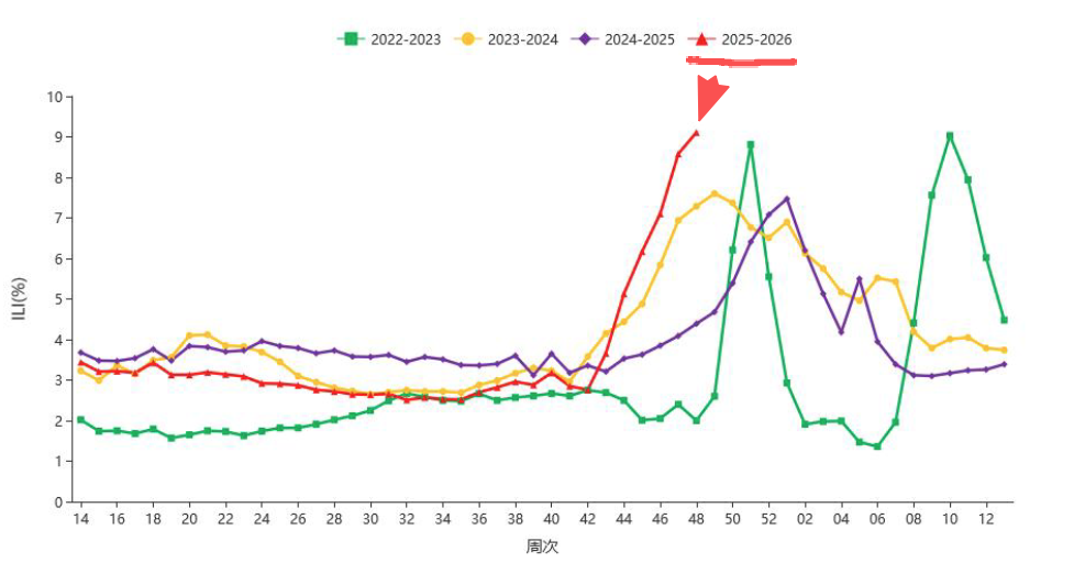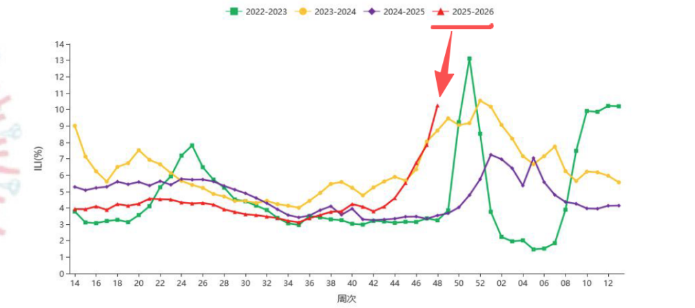 从中国疾病预防控制中心的流感监测数据看到,今年的流感季数据,已经打败其他年份同期,成为近 4 年之首。而更让人担忧的是,按照目前趋势,这个数据还在爬坡的势头上。